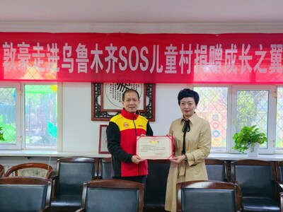 中外运敦豪西南分区总经理李斌将捐赠证书交至乌鲁木齐儿童村村长手中